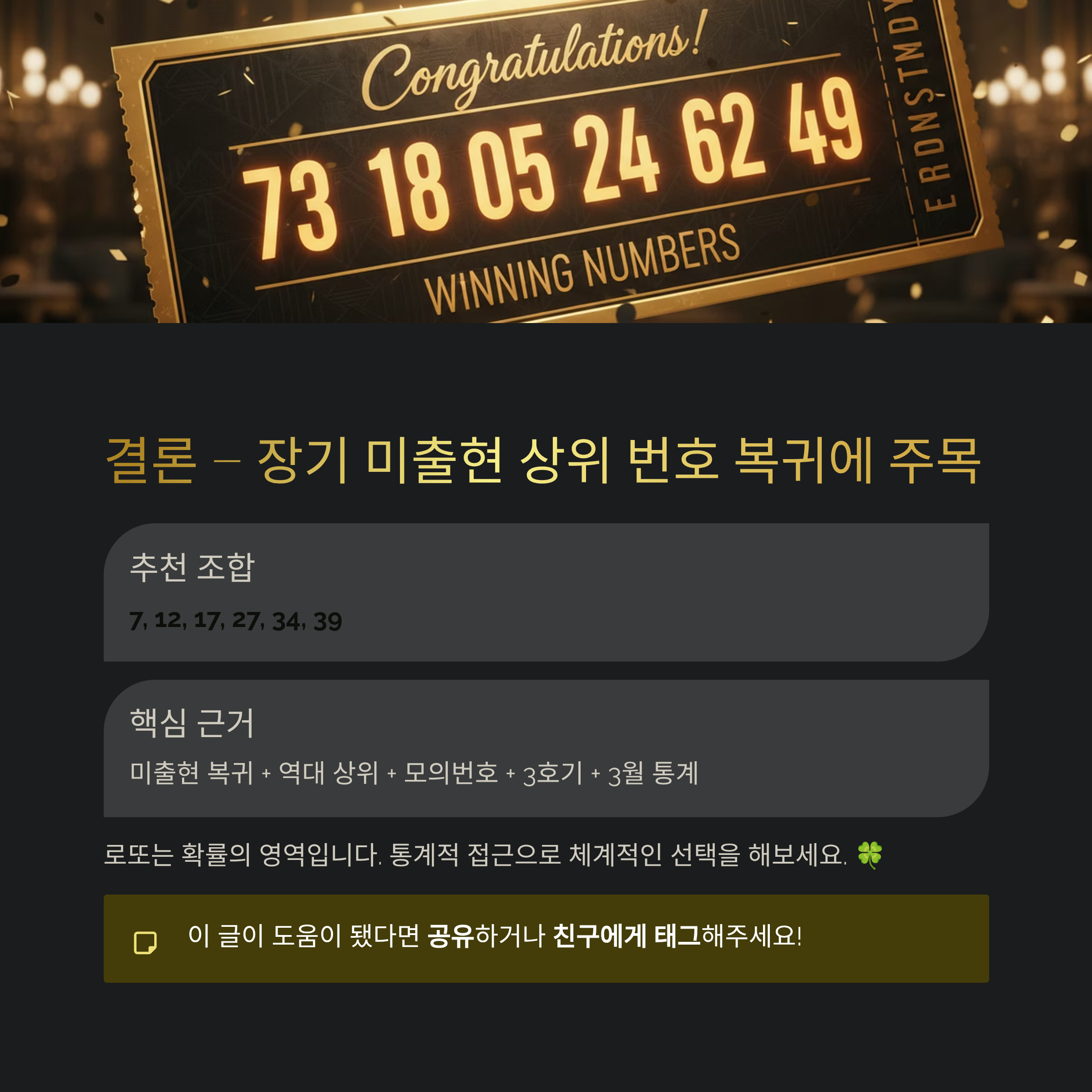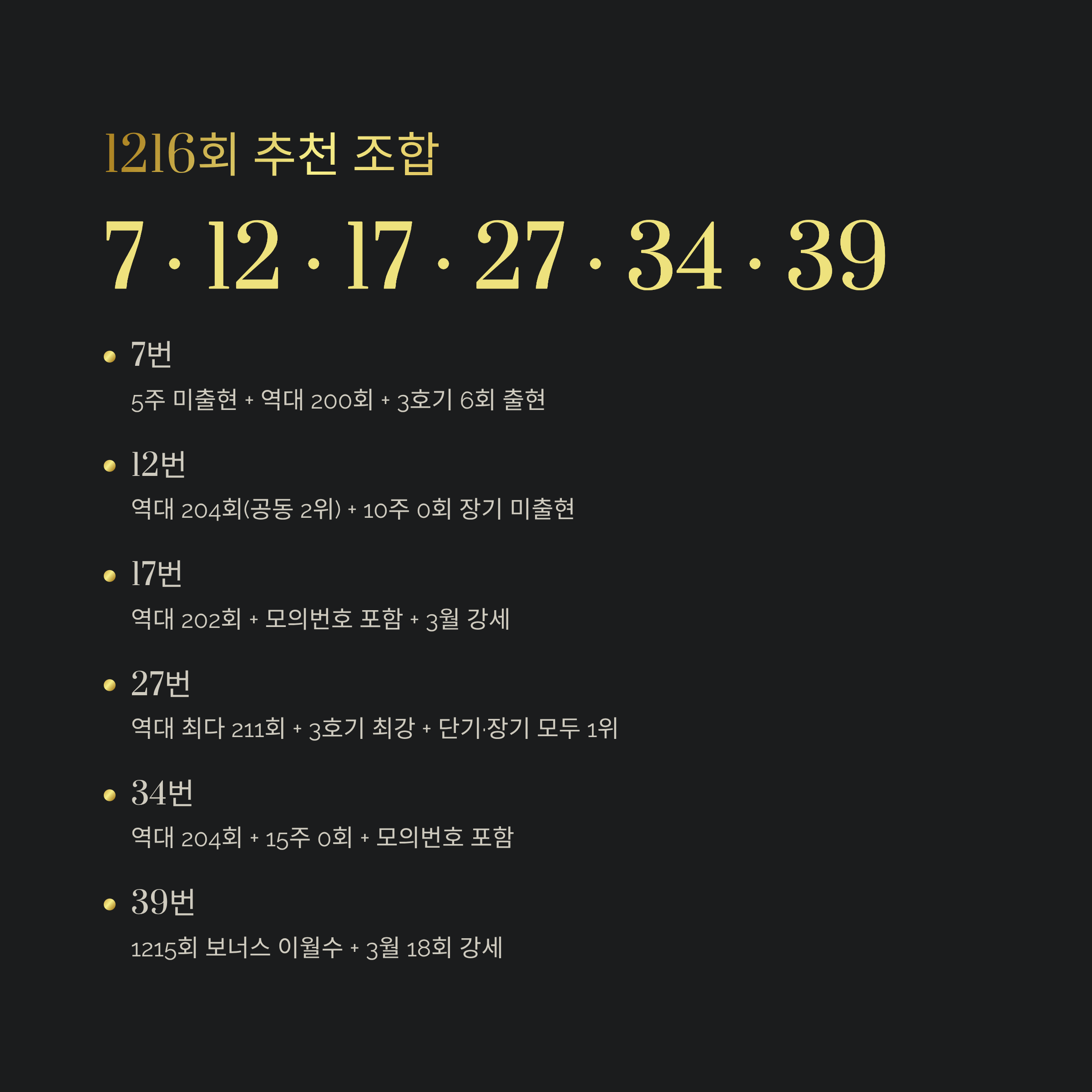 저는 오늘 분석을 종합해서 7, 12, 17, 27, 34, 39번 조합을 추천 드렸는데요. 미출현 복귀(7, 12, 17, 34), 역대 최상위 강세(27), 이월수(39), 모의번호 반영(17, 34), 3호기 추첨기 통계(7, 27), 3월 계절 통계(12, 17, 39) 등 여러 근거가 겹치는 번호들로 구성한 조합입니다.