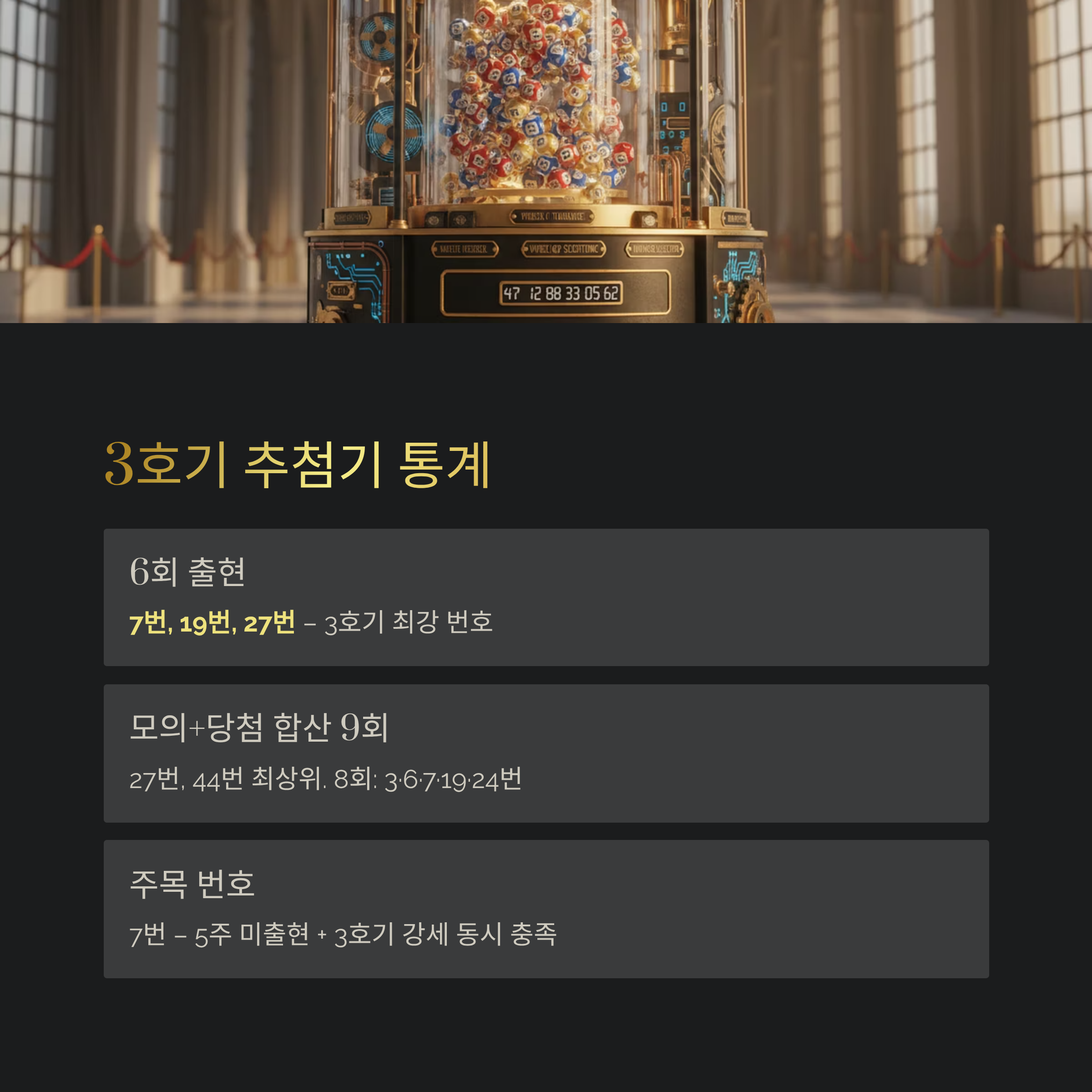 모의번호까지 합산하면 양상이 조금 달라지는데요. 3호기 최근 15회차 기준(당첨번호+모의번호 합산) 9회 출현이 27번, 44번이고, 8회 출현이 3번, 6번, 7번, 19번, 24번입니다. 27번은 당첨번호와 모의번호 합산 모두에서 최상위를 기록하고 있어서 3호기의 대표 강세 번호라 할 수 있어요.