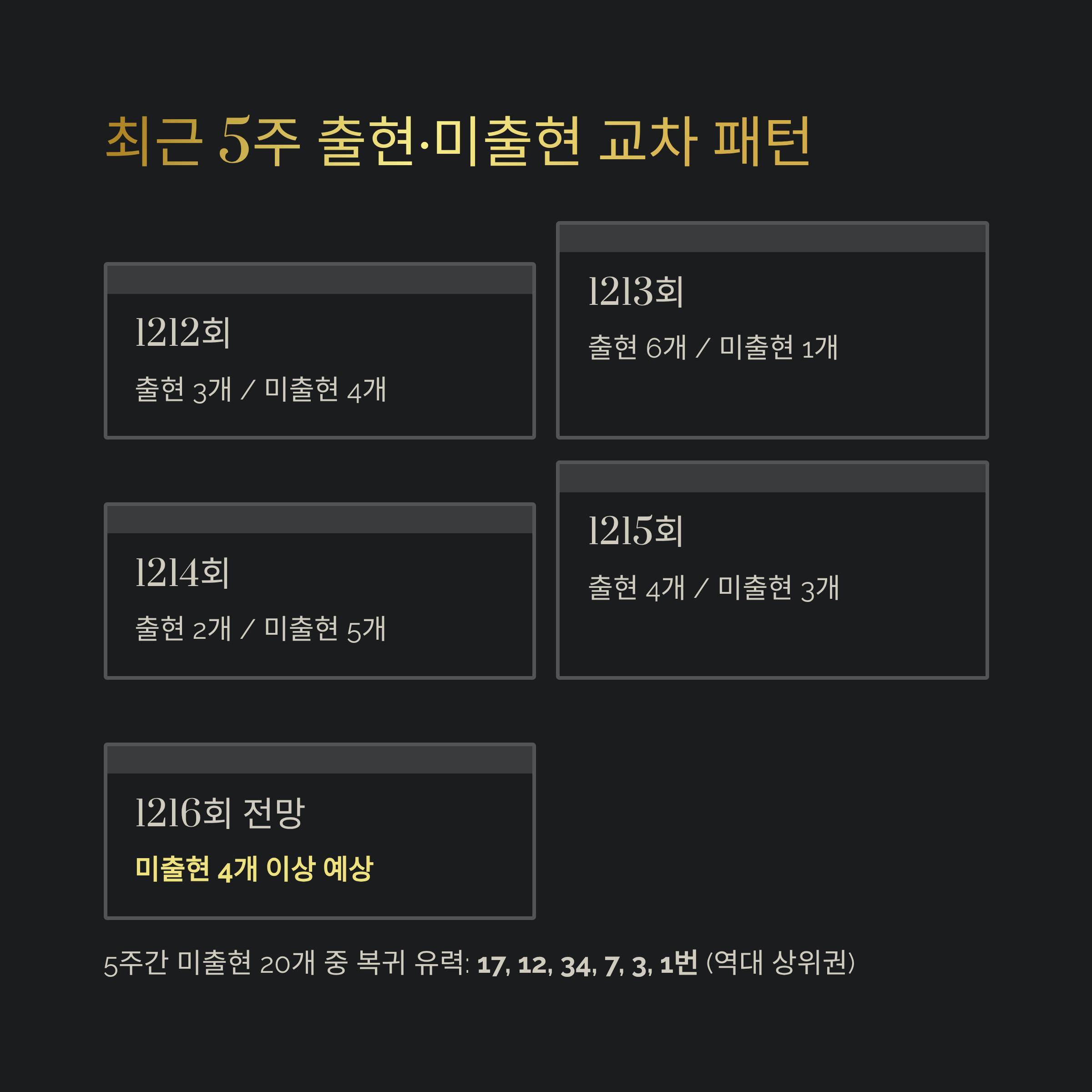 이 중에서 역대 출현 횟수가 높은 17번, 12번, 34번, 7번, 3번, 1번 같은 번호들이 1216회에서 복귀할 가능성이 높다고 볼 수 있어요. 특히 12번과 34번은 15주간에도 각각 1회, 0회로 장기 미출현 상태라 복귀 압력이 상당합니다.