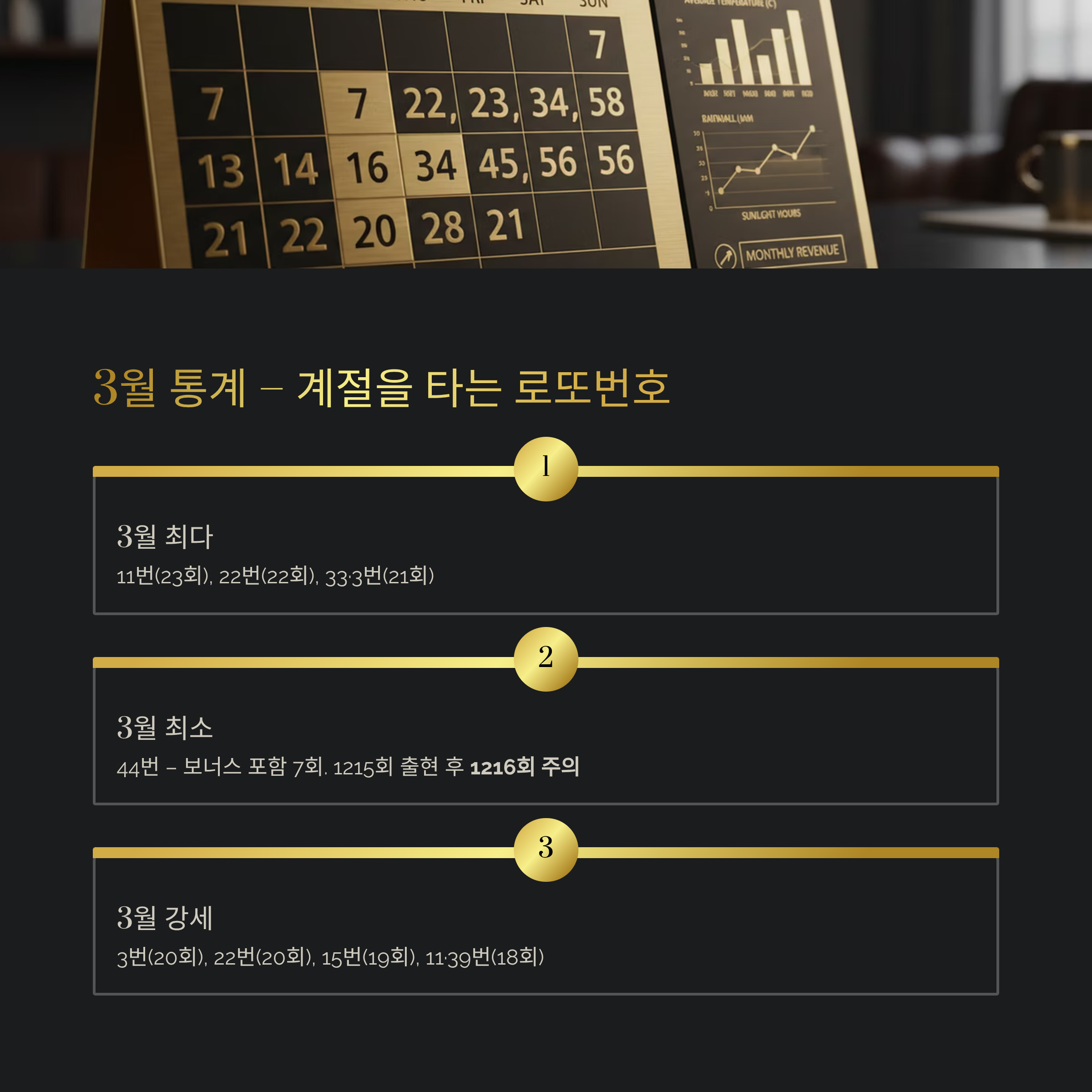 흥미로운 건 44번이 3월 통계에서 보너스 포함 7회, 보너스 제외 5회로 역대 3월 최소 출현번호라는 점이에요. 그런데 1215회(3월 14일)에서 44번이 당첨번호에 포함되었으니, 통계적으로 잘 안 나오던 번호가 한 번 터진 셈이죠. 이런 경우 다음 회차에 연속으로 나올 가능성은 상당히 낮아지기에 1216회에서는 44번을 조심할 필요가 있습니다.