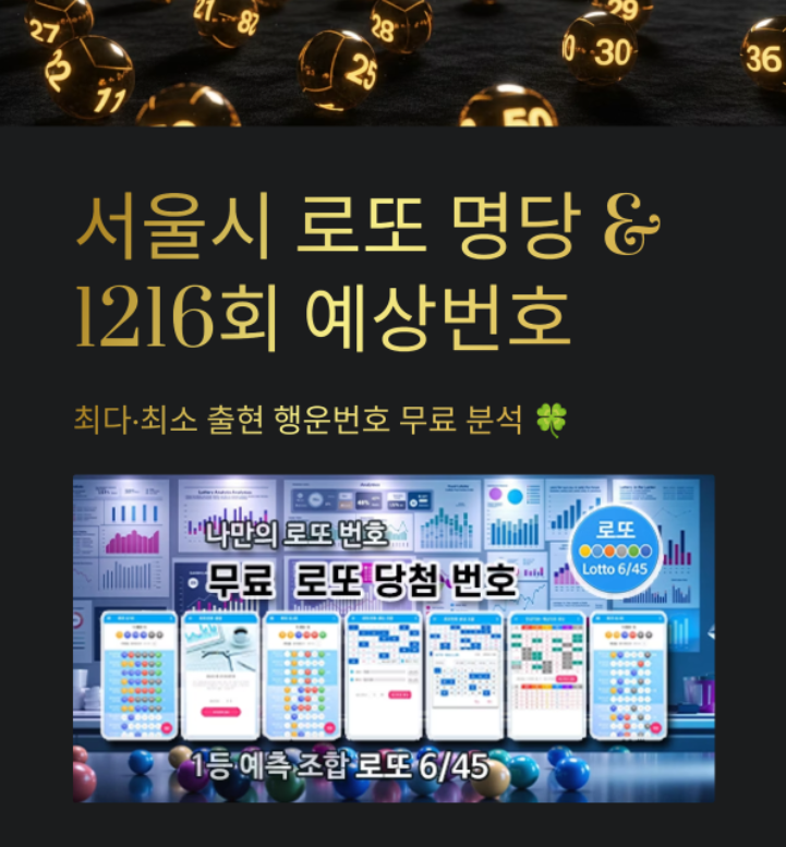 로또645 앱에서 1216회 예상번호를 무료로 받아보시고, 로또 명당 정보도 함께 확인해보시면 이번주 도전에 도움이 될 거라 생각합니다. 모두 행운이 함께하시길 바랍니다.